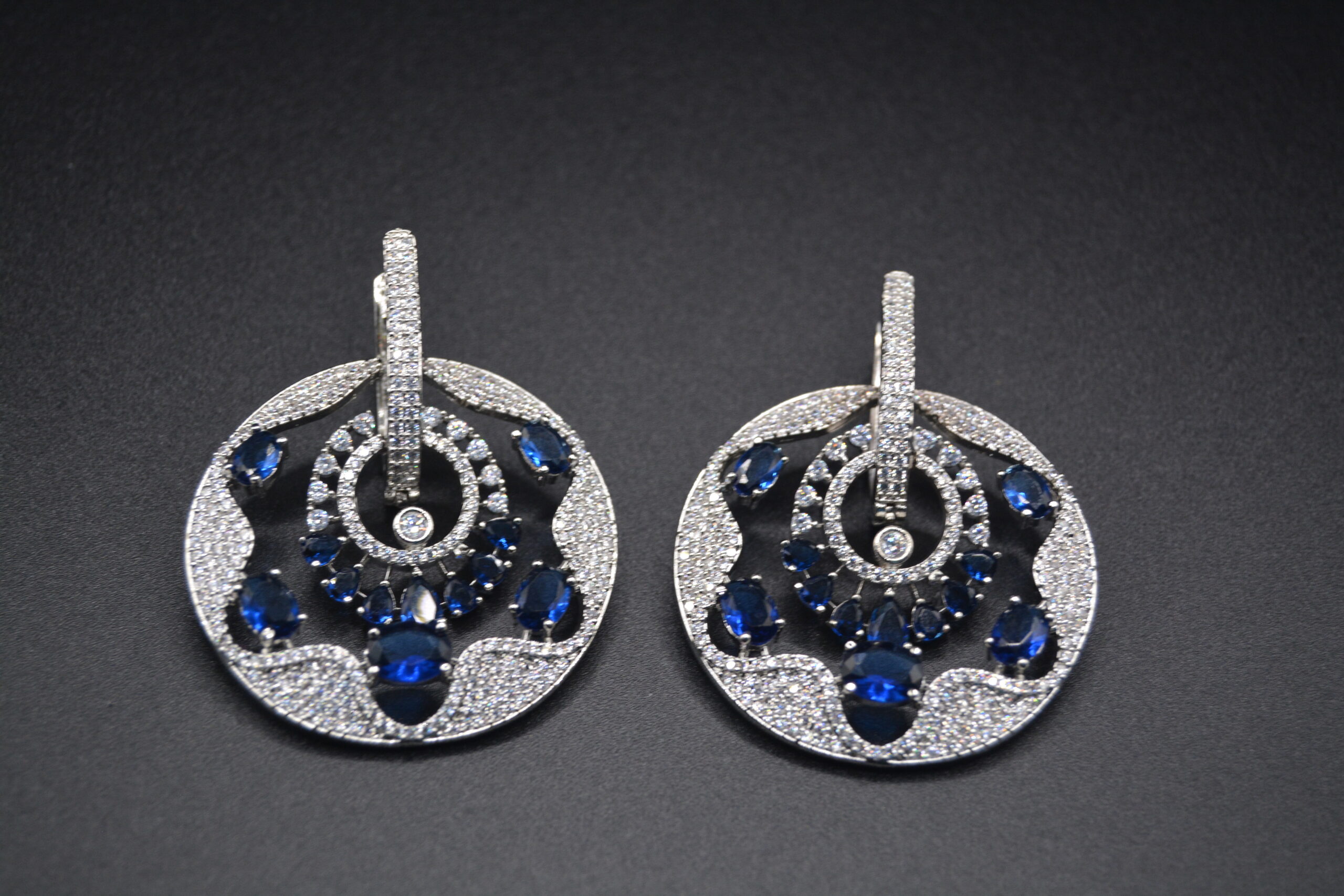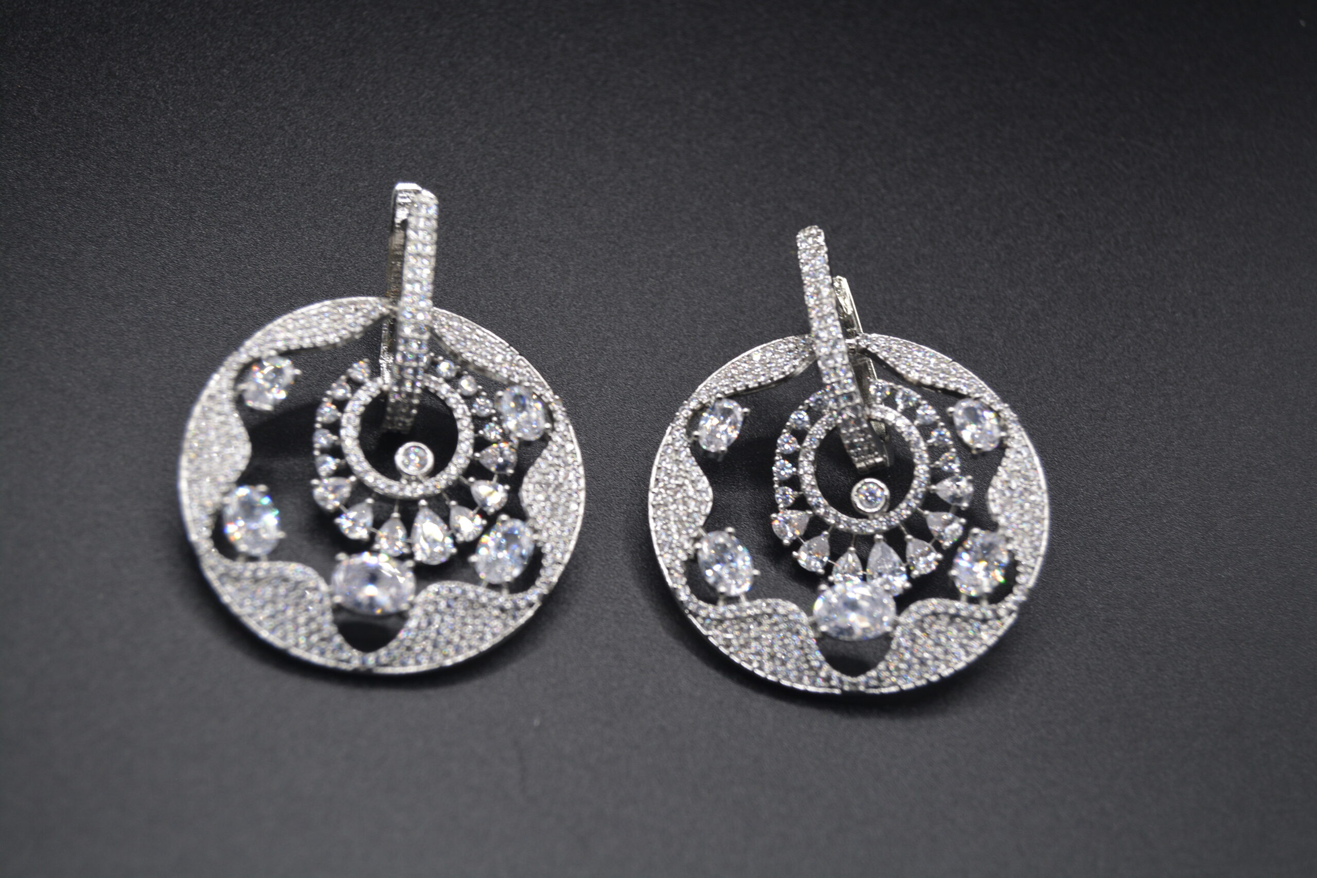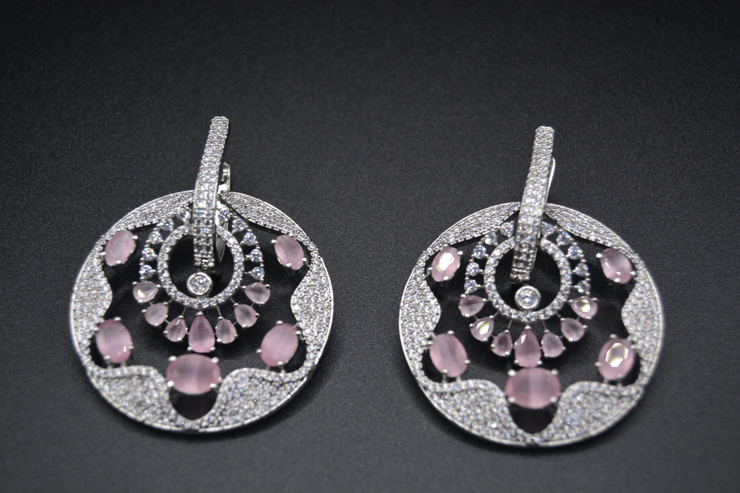These exquisite earrings feature oversized round drops that command attention. At the center of each round drop is a vibrant color stone, radiating a captivating hue that serves as the focal point of the design. Surrounding the central color stone are intricately filled CZ stones that create a dazzling and ornate border.