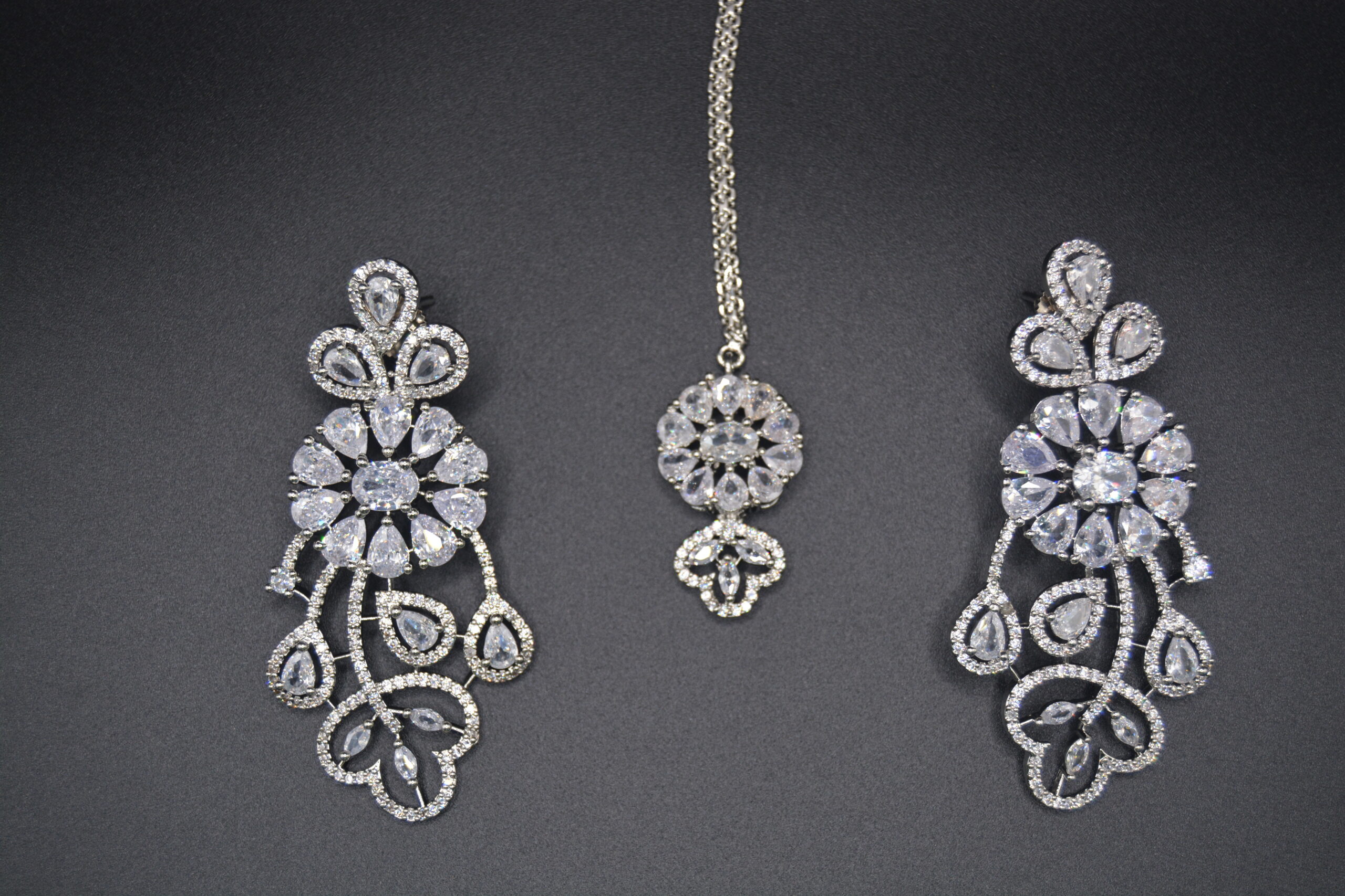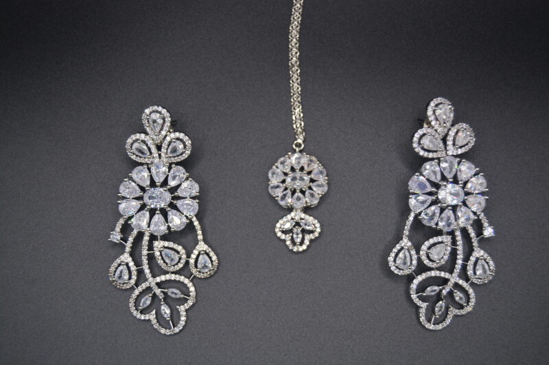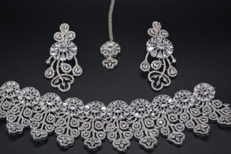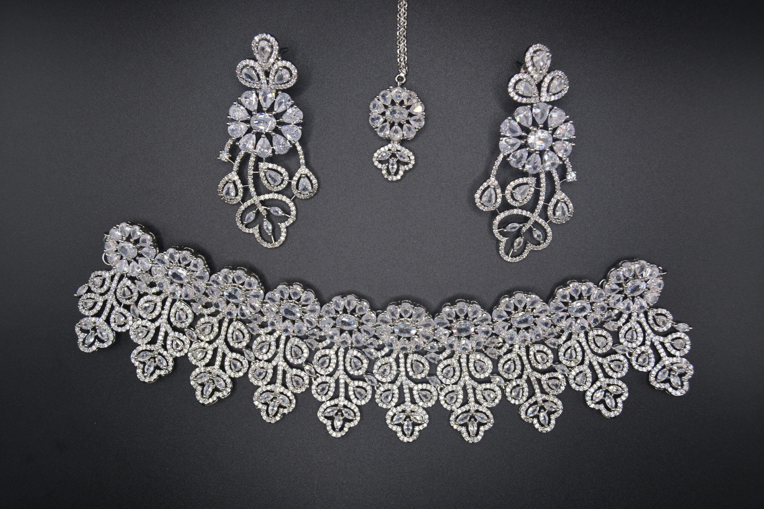 Introducing our dazzling White CZ Stone Choker Necklace and Matching Earrings and Maang tika Set, a graceful and versatile ensemble designed to adorn you with timeless elegance and sophistication.